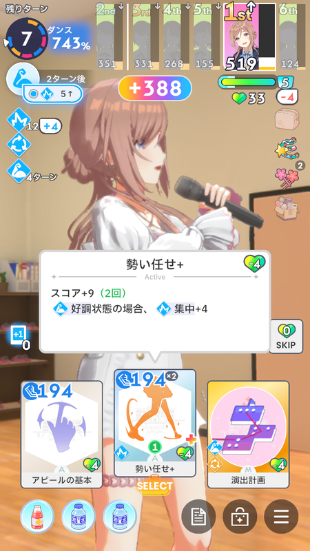適当にスコアを盛っていきます。好調1(応援効果込)を集中4に変換する《存在感》は、レート悪めなので封印します。